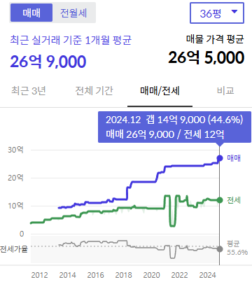 <판교푸르지오그랑블 아파트>의 가장 작은 면적인 36평형을 기준으로 살펴보면 2022년에서 2023년까지 약 24억2000만원의 실거래가를 유지하였습니다만 최근 2024년 12월에 26억9000만원으로 전고점 매매가격을 돌파하였습니다. 매매가격 그래프를 보더라도 이 아파트는 2011년 입주 이후 계속적인 계단식 상승 곡선을 그리고 있습니다. 판교역 주변은 시간이 지날수록 새로운 기업들로 가득차고, 생활 인프라도 풍부해지니 당연한 결과라고 볼 수 있겠습니다. 판교 지역은 앞으로도 대한민국을 IT 기술 강국으로 이끌어가는 핵심 역할을 할 것이라고 보고 있고, 이러한 영향에 따라 주변 아파트 가치 역시 지속적으로 상승할 것이라고 긍정적으로 평가됩니다.